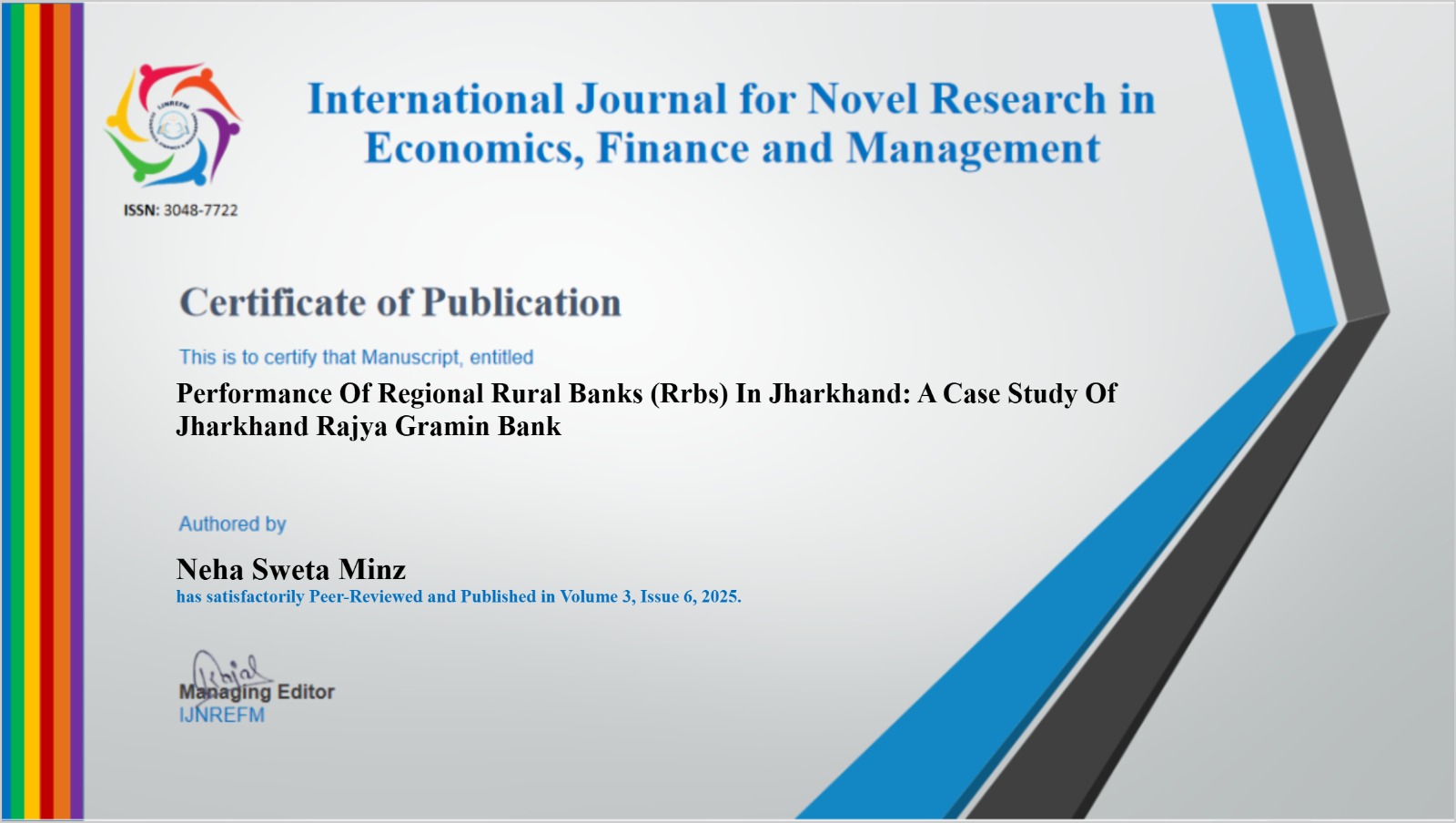Pubished Research Papers: Performance of Regional Rural Banks in Jharkhand (A Case Study of Jharkhand Rajya Gramin Bank) |